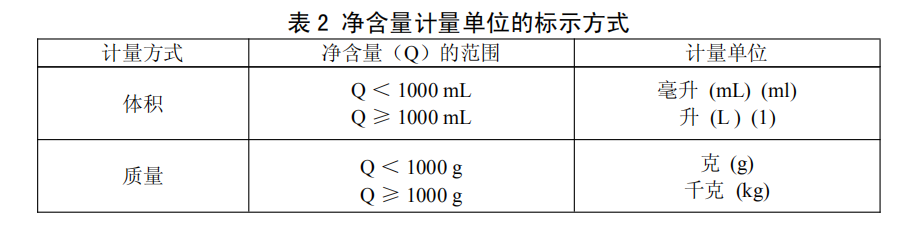 4.1.5.3 凈含量的計量單位應按表 2 標示。
